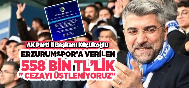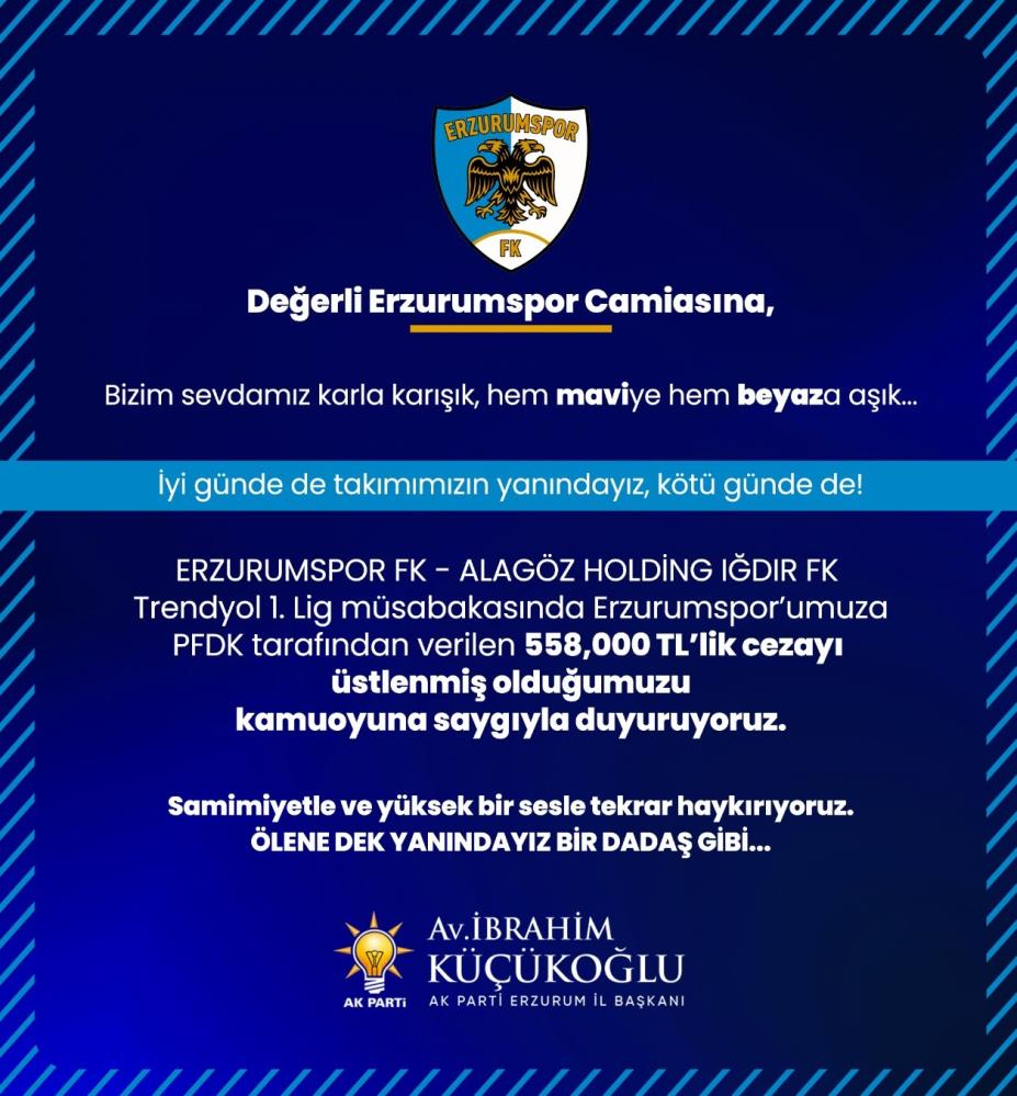 Hafta sonunda Erzurum’da oynanan Iğdır FK karşılaşması sonrası PFDK tarafından Erzurumspor’a verilen 558 bin TL’lik cezayı üstleneceklerini açıklayan Başkan Küçükoğlu sosyal medya hesabından yaptığı paylaşımda , “Değerli Erzurumspor camiasına, Bizim sevdamız karla karışık, hem maviye hem beyaza aşık. İyi günde de takımımızın yanındayız, kötü günde de! Erzurumspor Fk – Alagöz Holding Iğdır Fk 1. Lig müsabakasında Erzurumspor’umuza PFDK tarafından verilen 558,000 TL’lik cezayı üstlenmiş olduğumuzu kamuoyuna saygıyla duyuruyoruz. Samimiyetle ve yüksek bir sesle tekrar haykırıyoruz.