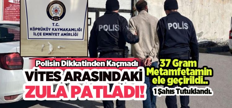 Erzurum İl Emniyet Müdürlüğü Köprüköy İlçe Emniyet Amirliğince uyuşturucu ile mücadele kapsamında uyuşturucu satan veya kullanan şahısların yakalanmasına yönelik yapılan çalışmada Şehitler Mahallesi Bahattin Karasu Caddesi üzerinde şüpheli bir araç durduruldu. Şahsın şüpheli ve tedirgin hareketler sergilemesi üzerine şahsın kullanmakta olduğu araç için Nöbetçi Cumhuriyet Savcılığınca gerekli arama kararı alındı. Aracın yapılan aramasında araç vites ile teyip arasındaki iç kısmında hazır zula ve 2 parça halinde toplam daralı ağırlığı 37.14 gr gelen beyaz poşet içerisinde metamfetamin olduğu değerlendirilen uyuşturucu madde yakalandı.