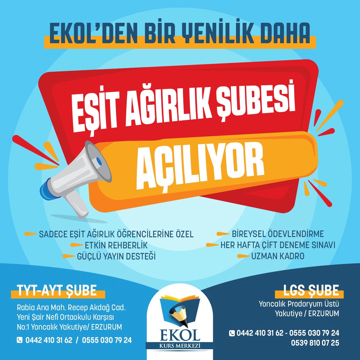 ” Sadece lise mezunlarına yönelik Erzurum’un tek eşit ağırlık kursu ve ortaokul öğrencileri için LGS kursu ile de hizmet verecek.Ekol ‘ün yeni şubesinde; hafta içi her gün eşit ağılık mezun öğrencileri , hafta sonu iki gün ortaokul 7. ve 8. sınıf LGS öğrencileri ders görecek.