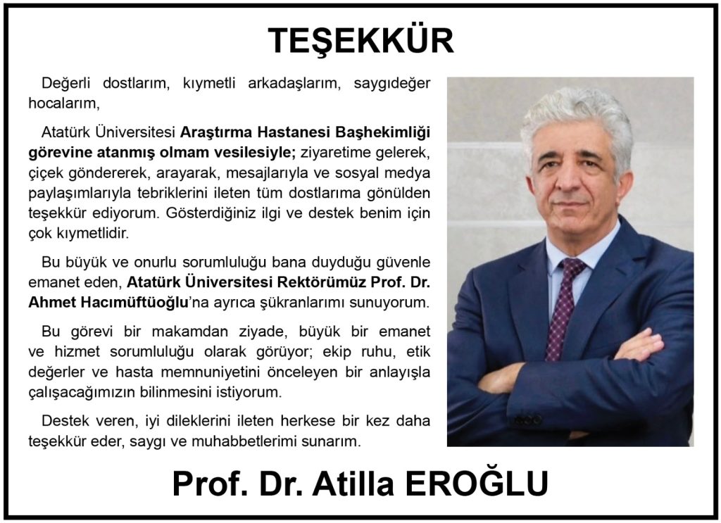 Atatürk Üniversitesi Araştırma Hastanesi’nin Yeni Başhekimi Prof. Dr. Atilla Eroğlu’ndan ‘Güven ve Hizmet’ Vurgusuyla Teşekkür Mesajı… 2 Aralık 2025 tarihinde Atatürk Üniversitesi Araştırma Hastanesi Başhekimliği görevine atanan, alanının başarılı ismi Prof. Dr. Atilla Eroğlu, görevi devralmasının ardından bir teşekkür metni yayımladı. Prof. Dr. Eroğlu, ziyaret, çiçek, mesaj ve sosyal medya paylaşımlarıyla tebriklerini ileten tüm dostlarına gönülden teşekkür ederken, özellikle kendisine bu “büyük ve onurlu sorumluluğu” emanet eden Atatürk Üniversitesi Rektörü Prof. Dr. Ahmet Hacımüftüoğlu’na şükranlarını sundu. Yeni Başhekim, ekibiyle birlikte ‘ekip ruhu ve hasta memnuniyeti’ odaklı bir çalışma sergileyeceklerini belirtti.